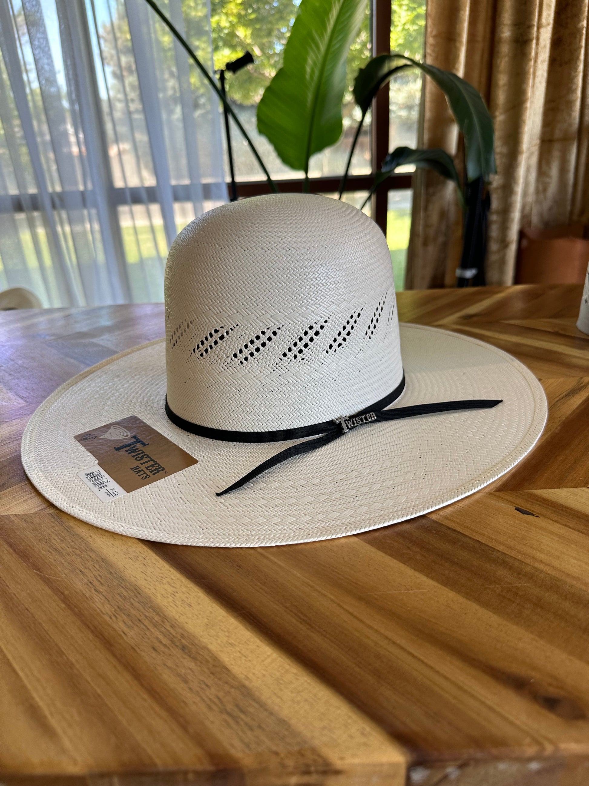 20X Shantung straw by Twister. Open crown, 4-1/2” brim
